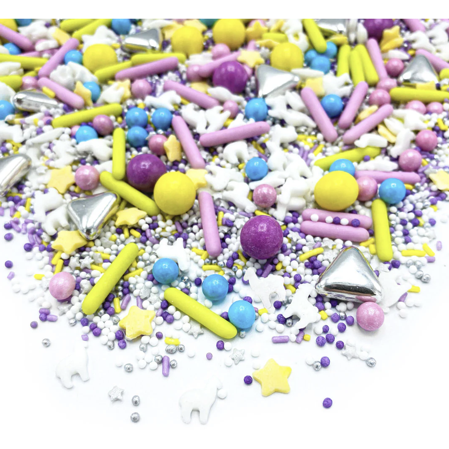 Lamy jsou na útěku! V barevné sypací směsi (No) Drama Lama jsou tato roztomilá zvířátka úplně v popředí a my jim prostě nemůžeme odolat! Kromě bílých lam šíří báječnou náladu také žluté a fialové čokoládové kuličky, zelené a fialové tyčinky, modré perly a žluté hvězdičky. Tato posypová směs je prostě absolutní pastvou pro oči na každém pečivu v každém ročním období, ať už jde o cupcake, donut, dort nebo sušenku!