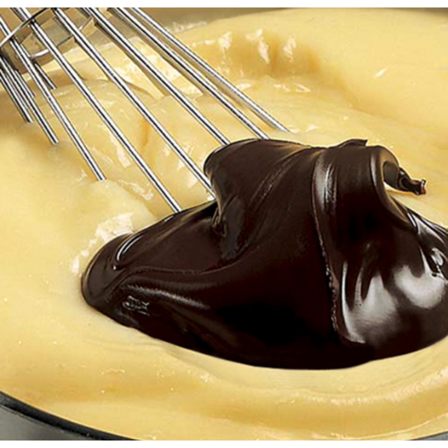 Tmavě hnědá pasta na bázi čokoládového prášku a rostlinných olejů.