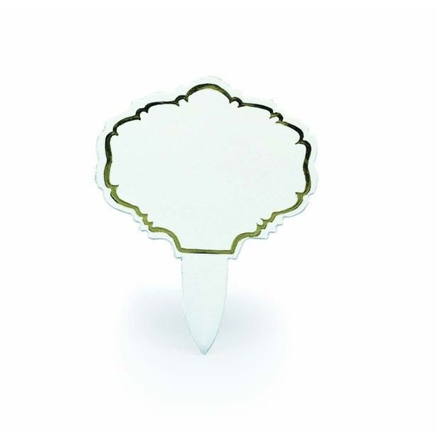 Plastové zapichovací cenovky bílé barvy se zlatým okrajem.