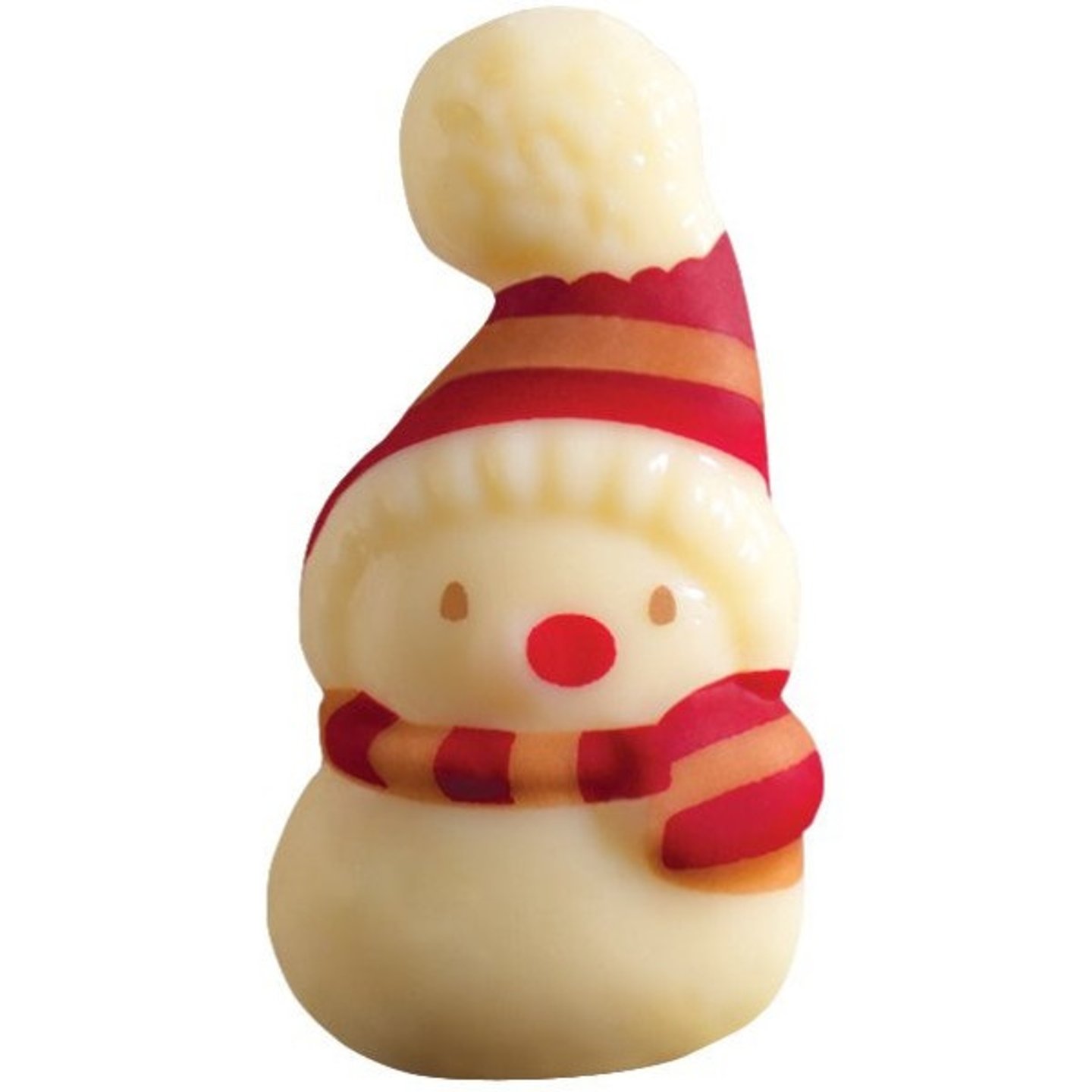 Dekor ve tvaru sněhuláka s červenou šálou na bílé čokoládě.